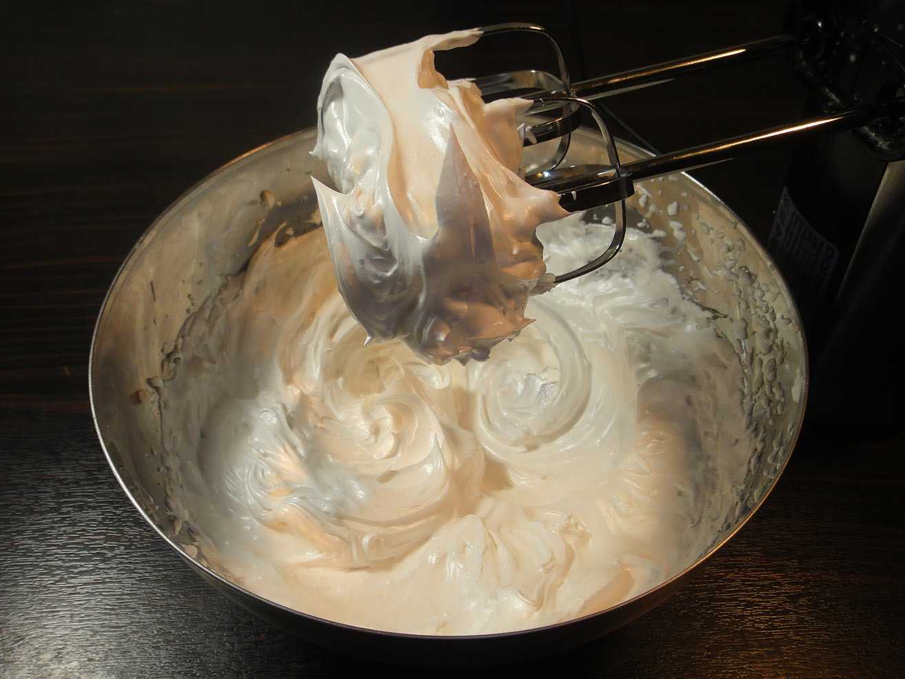 - При ручном взбивании сахар успевает раствориться без остатка, а при использовании миксера вы сэкономите силы и время, однако должны будете более пристально следить за белковой массой (если в ней останутся сахарные кристаллики, крем не будет эластичным).