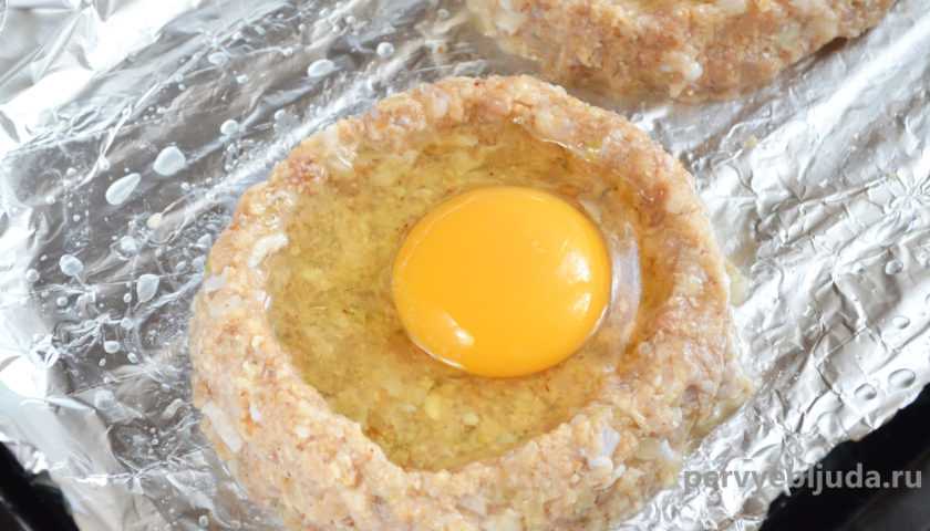 • По такому принципу мясные корзиночки можно приготовить с перепелиными яйцами. На одну порцию берем 3 яйца.