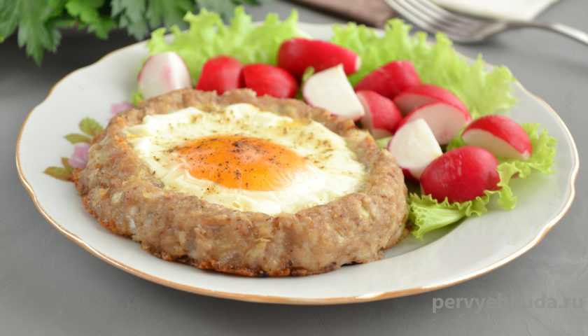 9. Оригинально, вкусное и очень красивое блюдо котлеты Гнезда из фарша и яйца в духовке перекладываем на тарелку с овощным салатиком или просто нарезанными овощами и подаем на завтрак с хрустящим свежим хлебом. Если блюдо подаем как главное, то дополняем его горячим гарниром и подаем. На гарнир отлично подойдет пюре из гороха или картофеля.