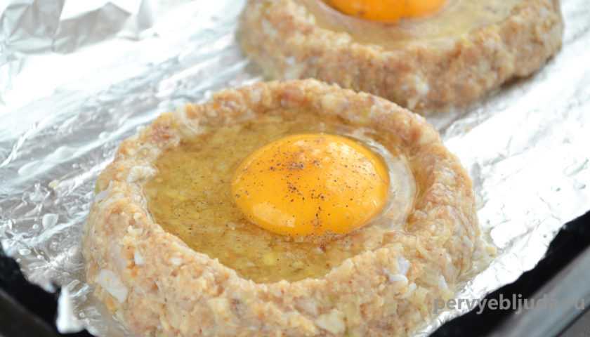 8. Посыпаем яйца молотым перцем и солью. Мясные корзиночки с яйцами ставим в духовку, разогретую до 220 градусов, и запекаем около 20 минут. Как только белок и желток станут плотными, блюдо сразу вынимаем из духовки.