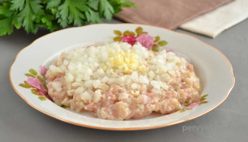 1. Если курица пропущена через мясорубку без лука и чеснока, куриный домашний фарш дополняем мелко нарезанными лучком и чесноком. Хорошо перемешиваем мясной фарш и слегка отбиваем. Когда отбиваем фарш, в волокна мяса попадает влага и при жарке или запекании в духовке изделия из такого мяса всегда получатся нежными и сочными.