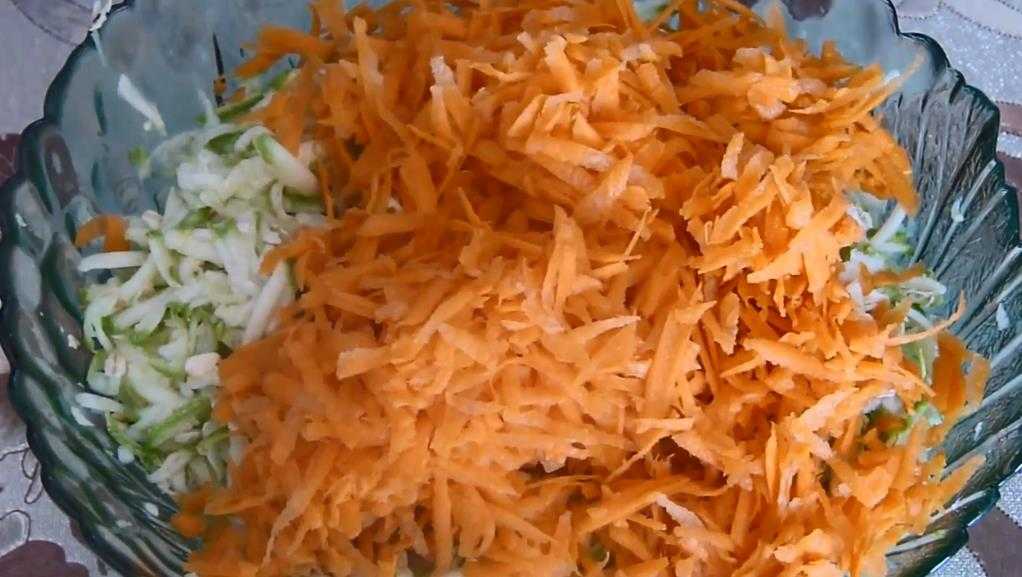 - Удаляю толстую кожуру и крупные семена у кабачка и тру его на крупной терке, добавляю соль. Чтобы убрать лишнюю влагу, помещаю кабачок на дуршлаг, установленный на миску для жидкости. Руками или при помощи марли сминаю тертый овощ, чтобы удалить остатки сока.
