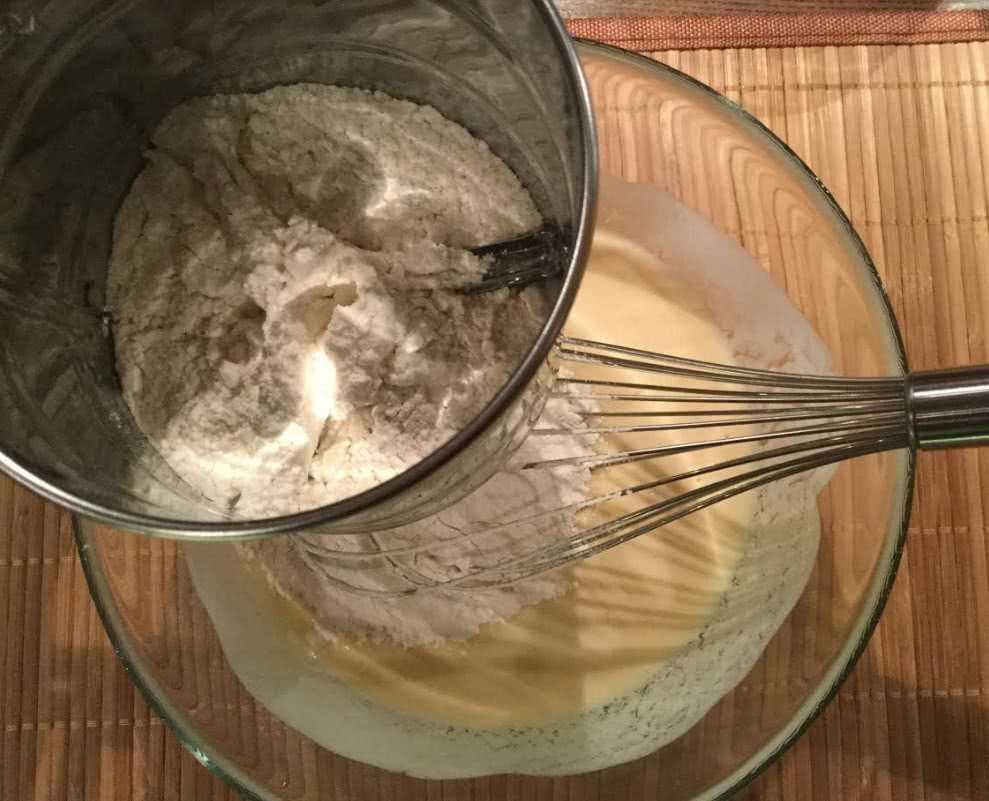 - После этого, постепенно всыпайте муку и разрыхлитель, продолжая взбивать, чтобы избежать комочков.