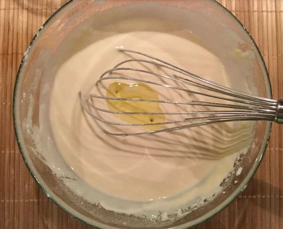 Шаг 4. Если после отдыха теста, густота его Вас не очень устраивает, разбавляем его еще раз водой до нужной консистенции и добавляем немного растительного масла.
