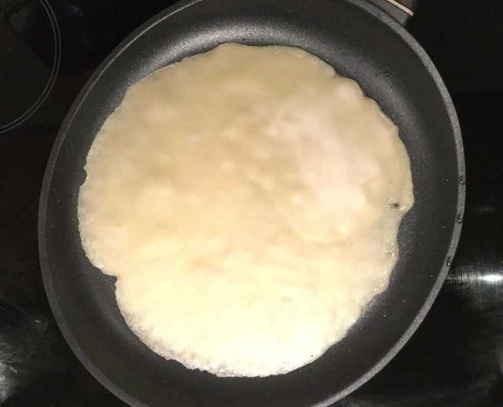 Когда на поверхности блина не осталось ни одного островка жидкого теста, его можно переворачивать. На фото ниже видно, что справа лепешка еще не пропеклась, переворачивать ее рано. Тесто по всей поверхности должно схватиться.