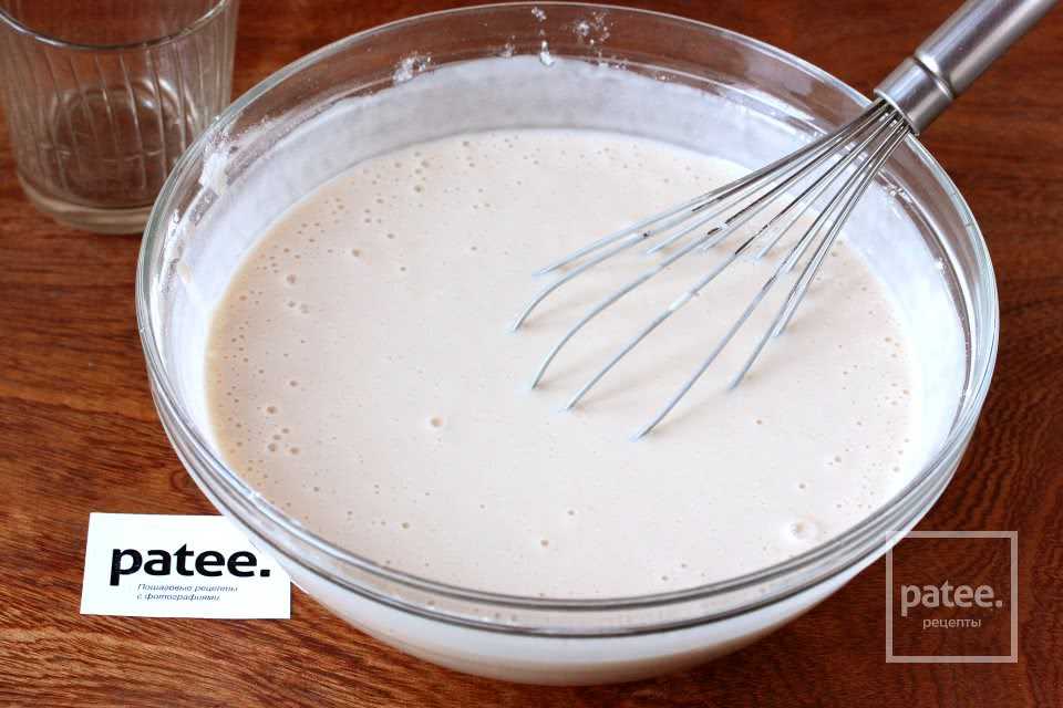 Готовое тесто для блинов на питьевом йогурте по консистенции должно напоминать жидкую сметану.