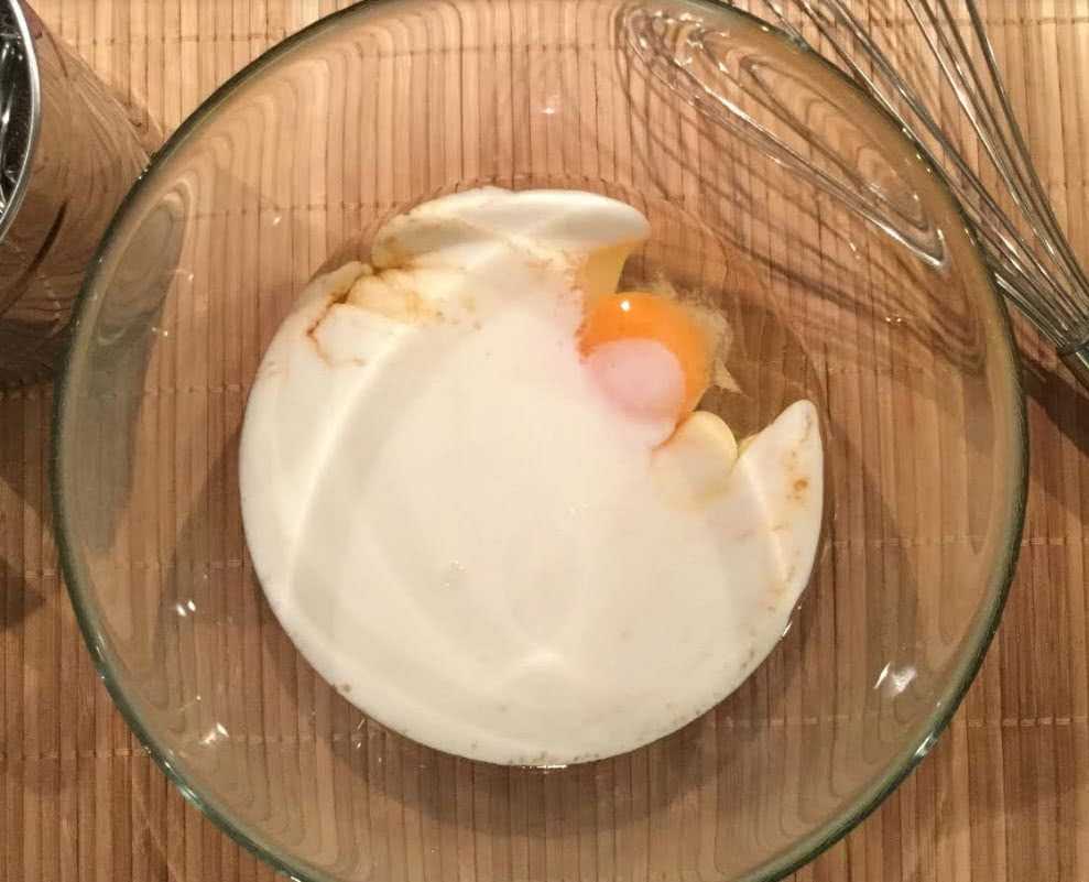 Тесто можно готовить заранее или перед самой жаркой. В миске смешиваем йогурт, соль с сахаром и яйцо. Молочку заранее достаем из холодильника, чтобы она была комнатной температуры. Тогда ингредиенты лучше перемешиваются. Добавляем к массе 50 мл растительного масла. Затем пропускаем муку через сито и всыпаем ее небольшими порциями в миску к остальным ингредиентам.