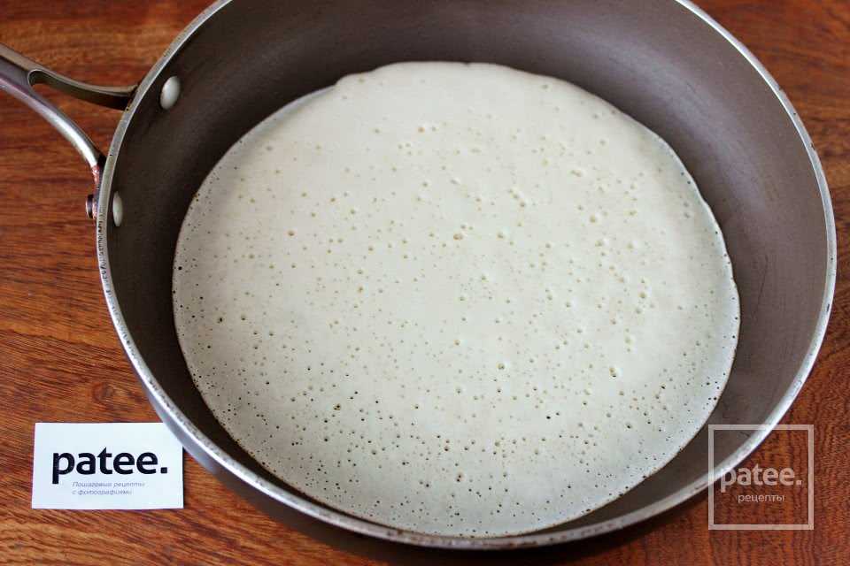 Хорошенько разогрейте сковороду и наливайте на нее по неполному половнику теста, распределяя его по всему дну сковороды.