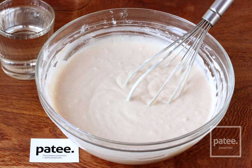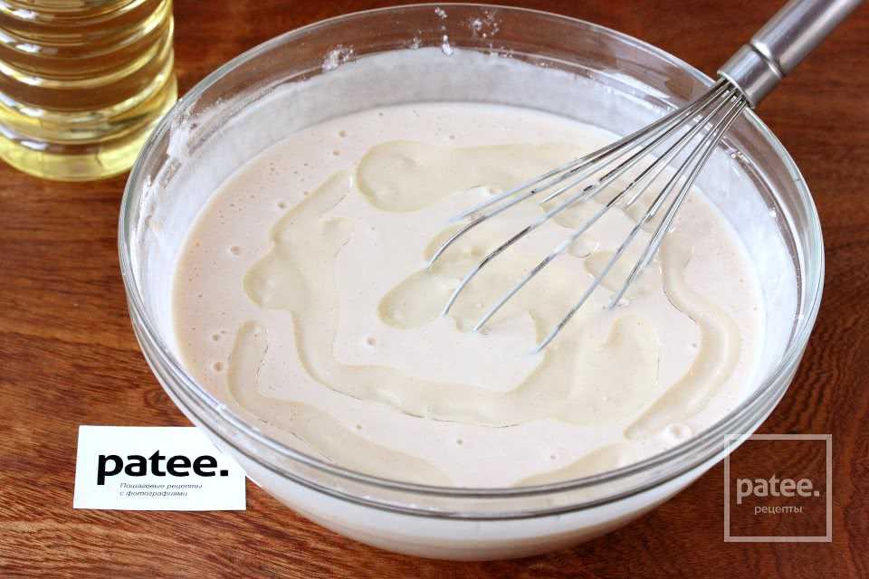 Аккуратно перемешиваем тесто венчиком. Если оно оказалось слишком жидким, добавляем еще немного просеянной муки. Тесто должно получиться однородным, по консистенции, как жидкая сметана. Оставляем его при комнатной температуре на полчаса.