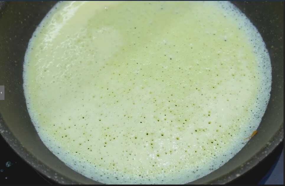 Практически сразу на поверхности пояляются пузырьки. Тесто шипит. И это при условии, что сковородка очень хорошо прогрета.