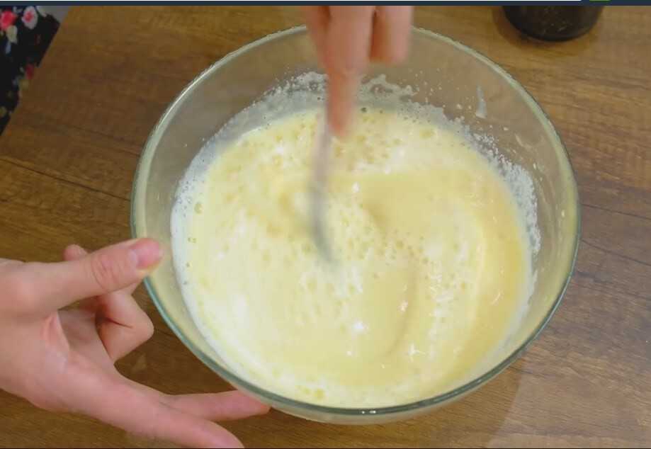 - В яйцо с сахаром подлить треть порции кислого молока.