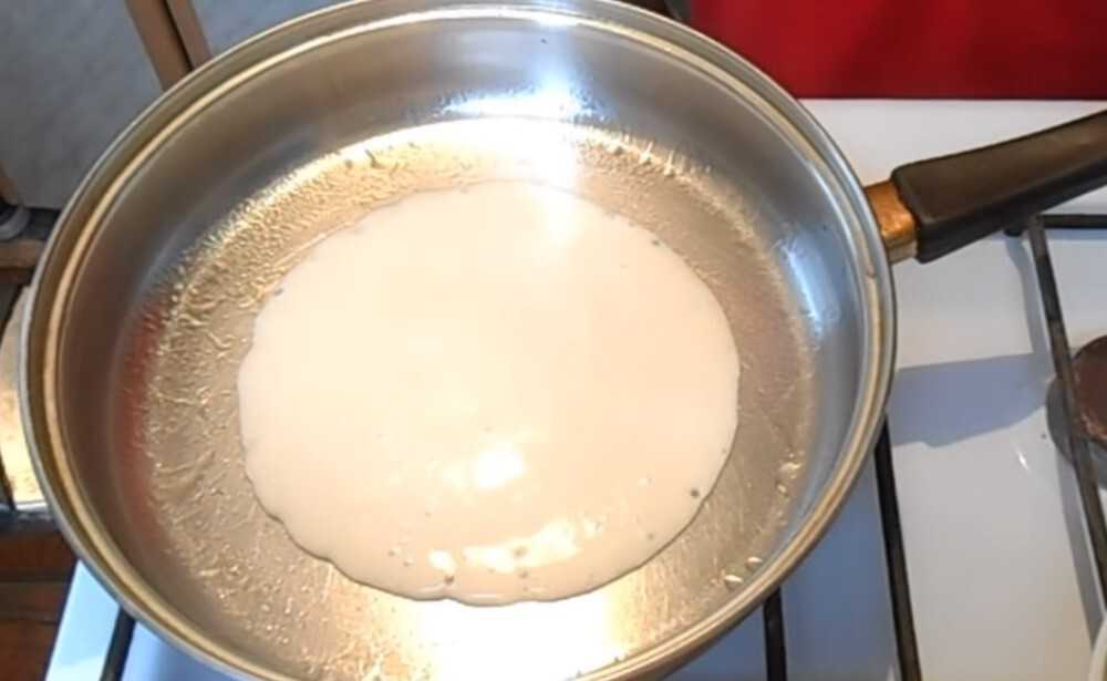 - Лить тесто на сковороду тонким слоем, чтобы блины получались тонкими. Обжаривать, как обычно, с двух сторон.