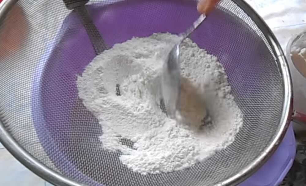 - Муку нужно просеять, чтобы в ней не оставалось комков, и небольшими порциями всыпать, очень интенсивно размешивая тесто.