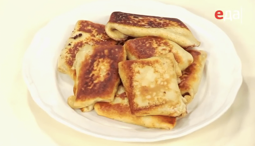 Поджариваем блинчики по первому рецепту: с одной стороны более румяные, с другой менее.