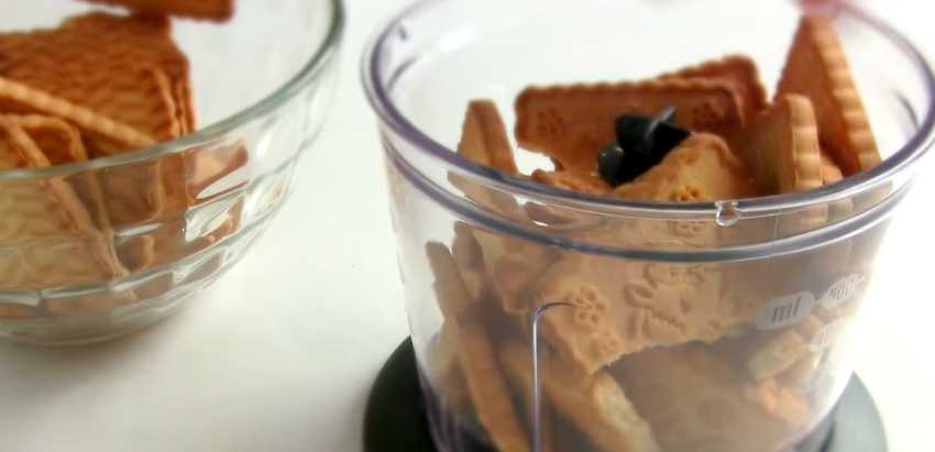 2. С помощью мясорубки измельчить любимое печенье. Или же высыпать его в блендерную чашу и превратить в мелкую крошку без комков и вкраплений больших кусочков.