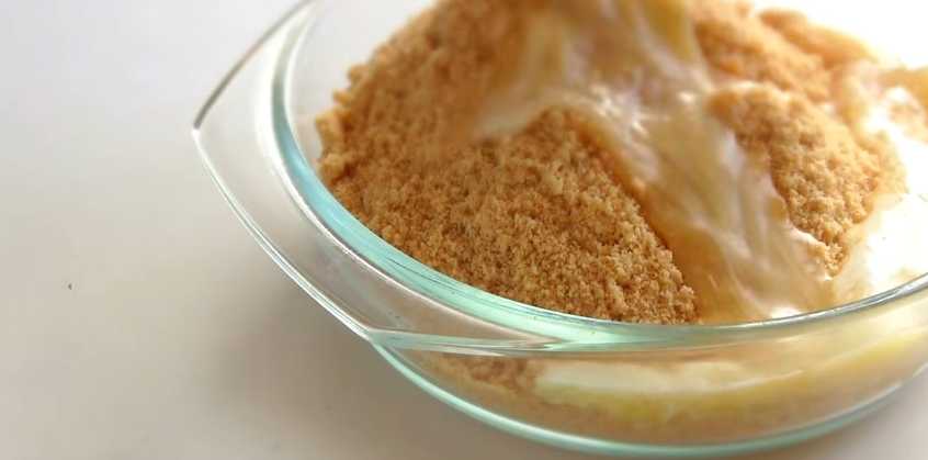 2. Слегка растопив сливочное масло, вылить его в сыпучую массу из печенья и тщательно размещать, чтобы маслянистая жидкость полностью распределилась в этой смеси.