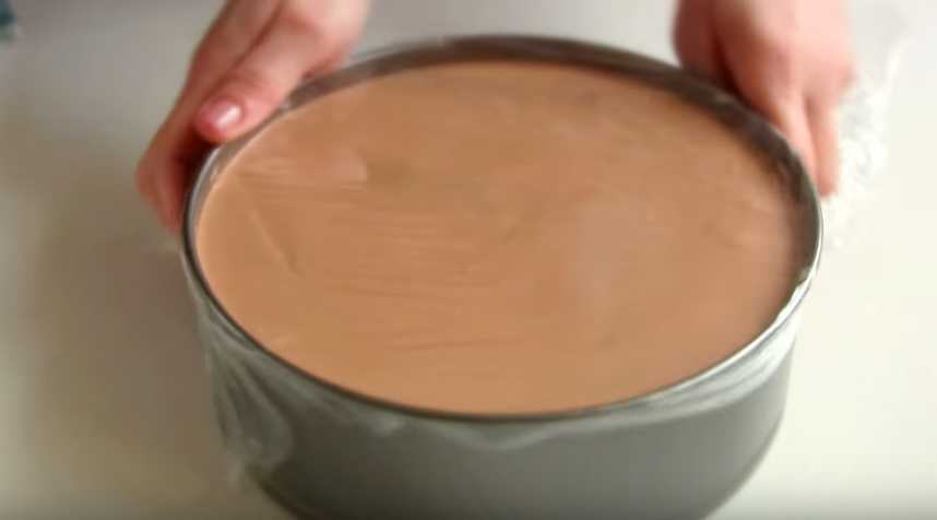 10 Остается только выложить полученную начинку в в разъемную форму с коржом, равномерно распределив по поверхности. Накрываем пищевой пленкой и отправляем на несколько часов в холодильник. Начинка должна полностью застыть.