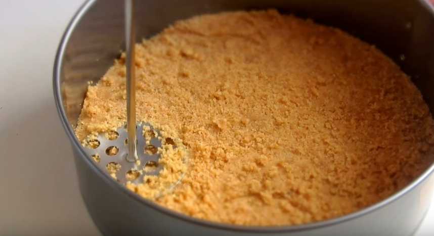 3. Пересыпав песочную основу в форму, при помощи толкушки или скалки с тупым концом придать ей плотности, чтобы получился довольно упругий слой, на котором будет держаться весь торт. Оставить пока настаиваться в холодильнике.