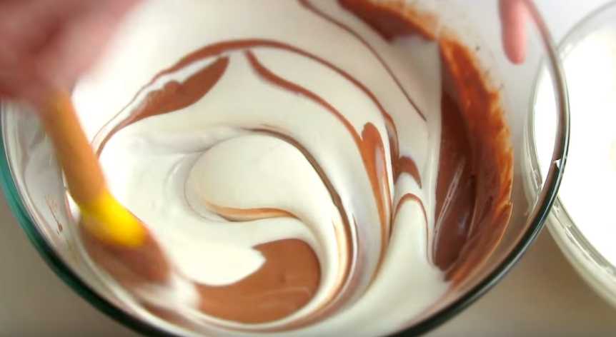 9 Аккуратно вводим сливки в полученную массу. Положили столовую ложку перемешали. А так повторять пока все сливки не окажутся перемешанные с основной массой.