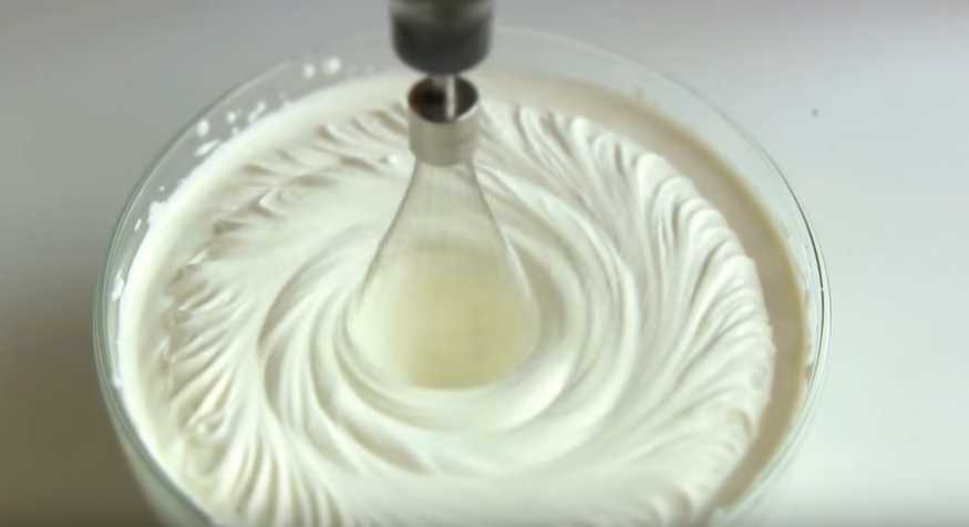 6. Охлажденные сливки вылить в глубокую миску и взбить, постепенно добавляя к ним сахар, до устойчивых пиков. Взбивать примерно 3-5 минут.