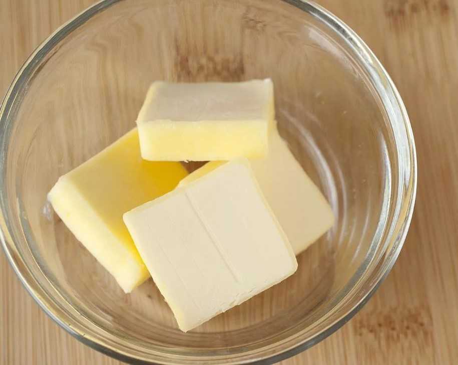 1. Сливочное масло или маргарин заранее достаньте из холодильника и нарежьте на кусочки. Оставьте ингредиент немного подтаять, но не растопиться. Нагревать масло не надо, просто оставьте его при комнатной температуре.