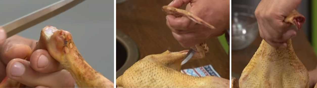 Для начала помоем и подготовим тушку. Отрежем лапы, крайние фаланги крыльев, шею.