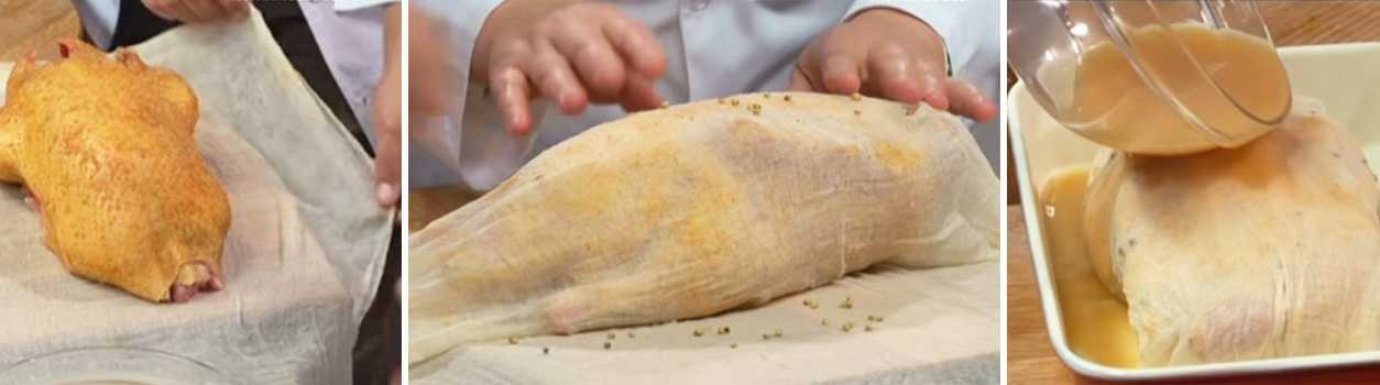 2. Очищаем и подготавливаем тушку, заливаем приготовленным рассолом, сверху можно положить небольшой грузик и оставляем на сутки, но не в тепле. Периодически птицу переворачиваем на другую сторону.
