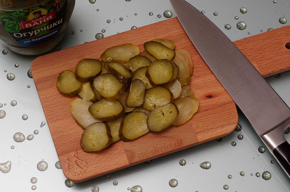 7. Маринованные огурчики порезать колечками или другими геометрическими формами на ваш вкус.