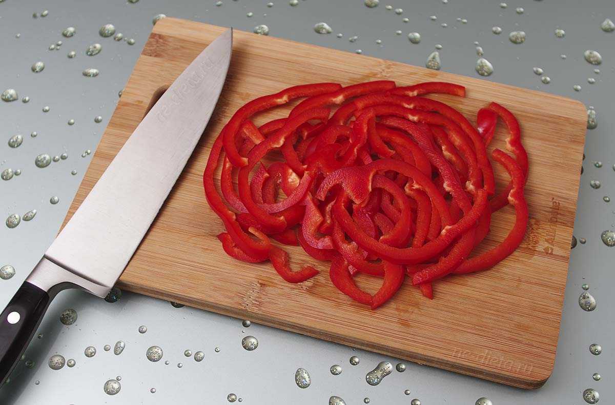 5. Болгарский перец очистить от семян и перегородок, после чего порезать длинной тонкой соломкой.