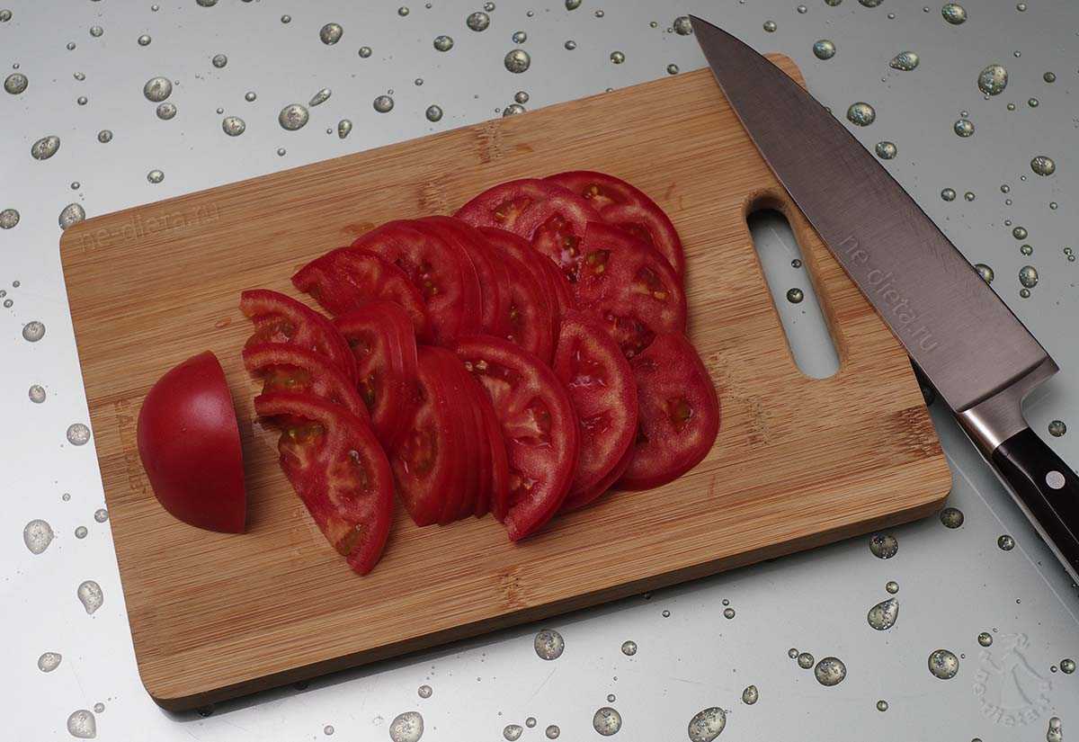 6. Помидор порезать полукольцами или крупными ломтиками любой формы, главное – чтобы при нарезке они не дали слишком много сока.