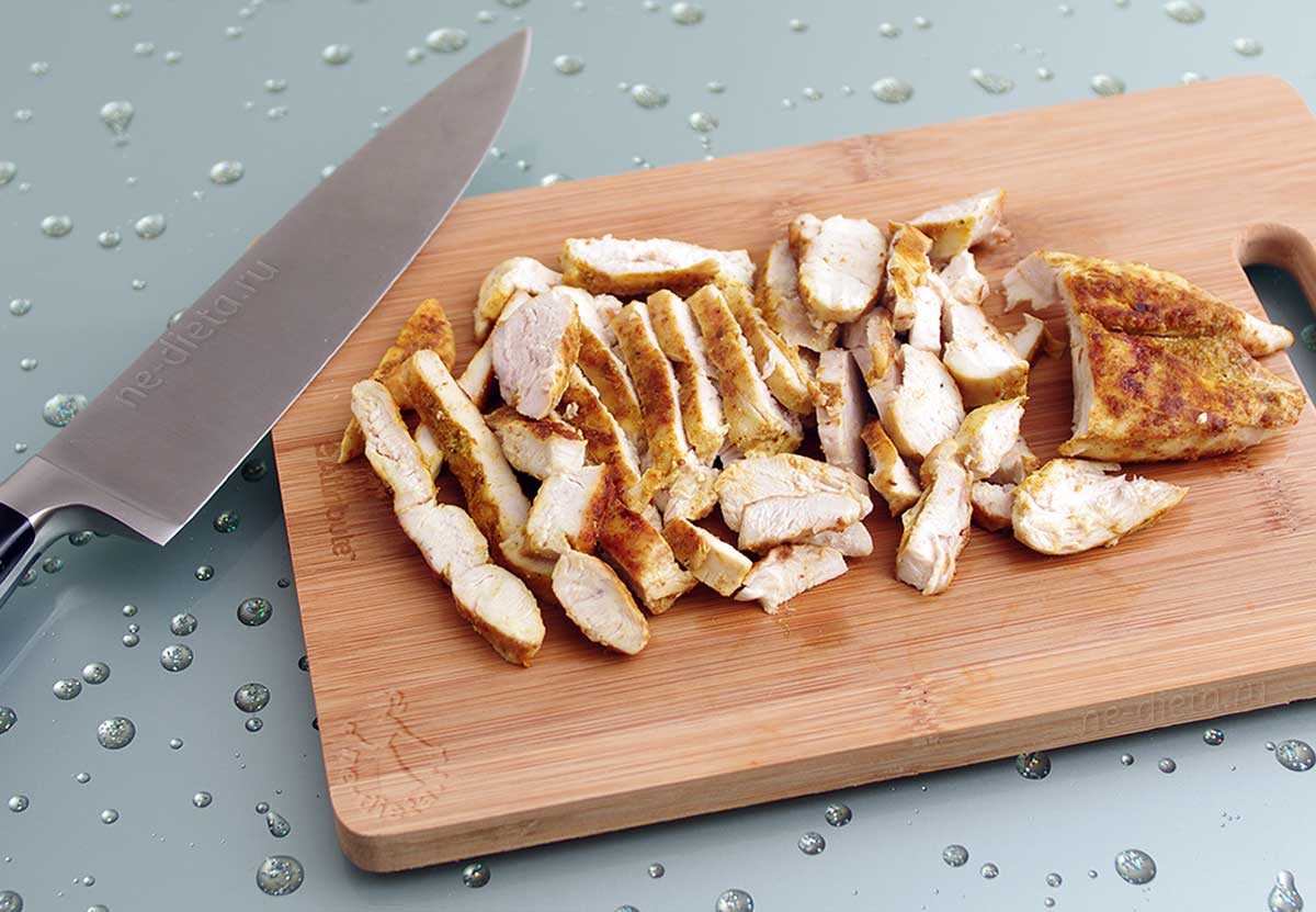 3. Готовое куриное филе нужно остудить и порезать поперек куска длинными ломтиками.