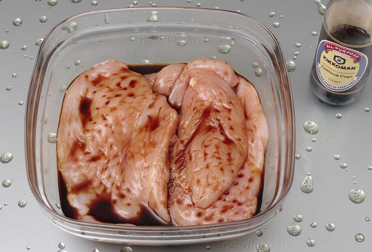 1. Для того чтобы приготовить вкуснейшие жареные конвертики из лаваша с разнообразной начинкой, прежде всего нужно замариновать курицу. В принципе, для этой оригинальной закуски можно использовать отварное или запеченное куриное филе, в особенности, если оно осталось после других блюд, но если вы собираетесь готовить курицу с нуля, то я советую вам попробовать мою коронную технологию приготовления. Филе вначале нужно залить соевым соусом и оставить при комнатной температуре на 30 минут. В процессе маринования его желательно хотя бы один раз перевернуть, чтобы соевый соус проник даже в самые укромные уголочки и хорошо пропитал всю курицу.