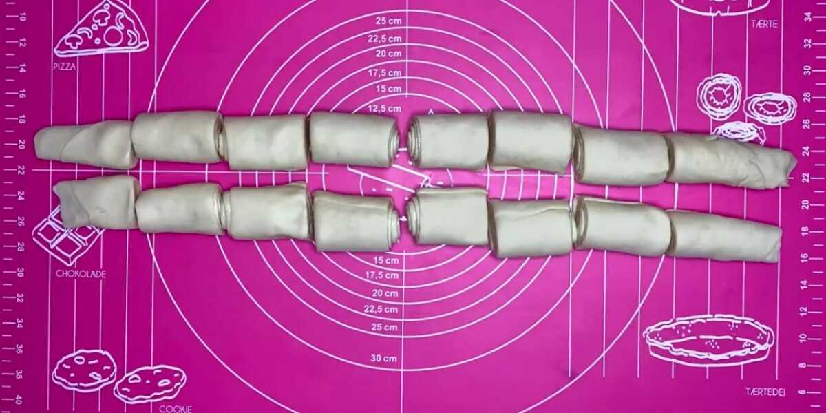 Раскатать тесто на прямоугольники размером 10х20 сантиметров.
