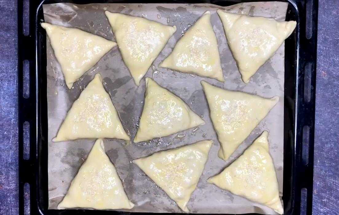 - Выложить самсу на противень, покрыть желтком с кунжутом. Выпекать в заранее разогретой до 180 градусов духовке в течение 15 минут.