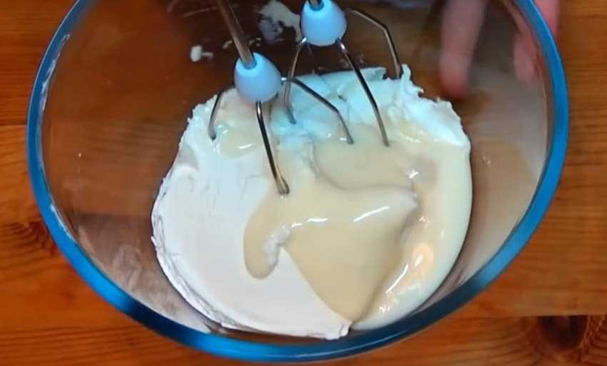 - В миске взбейте миксером сыр со сгущенкой до пышного состояния.