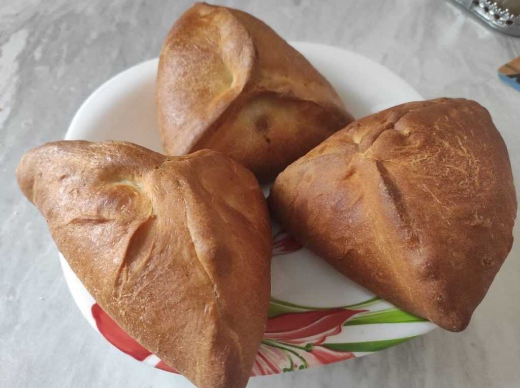 - Дрожжевое тесто разделить на 20 частей, раскатать на кружки. На каждый кружок выложить начинку: картофель с луком вниз, а фарш – наверх. Залепить в форме треугольника. Смазать яичным желтком. Дать постоять 20-25 минут.