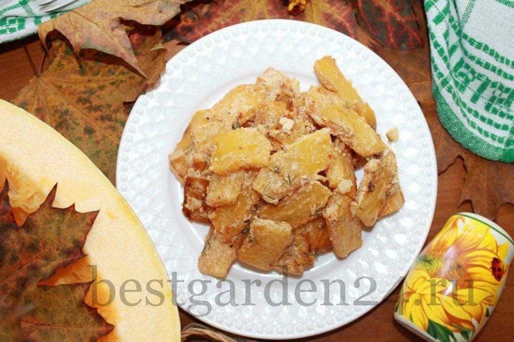 - Тыкву, тушеную в сметане с чесноком, перекладываем в общее блюдо либо подаем порциями.