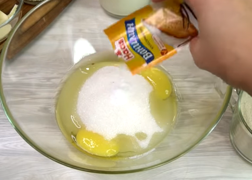 1. Перед приготовлением достаньте все продукты из холодильника за пол часа. Они должны быть комнатной температуры. В глубокой миске взбейте венчиком 2 яйца со стаканом сахара + пакетик ванилина.