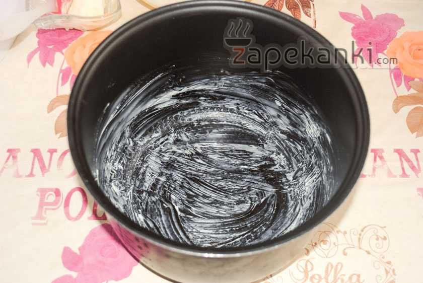 8. Чашу мультиварки смазать сливочным маслом. Вообще манник хорошо достаётся из чаши, но если вам страшно, что он может пристать и развалиться, то можете застелить пергаментной бумагой.