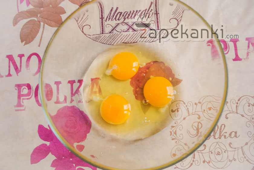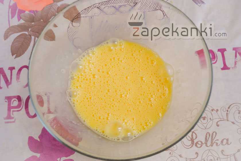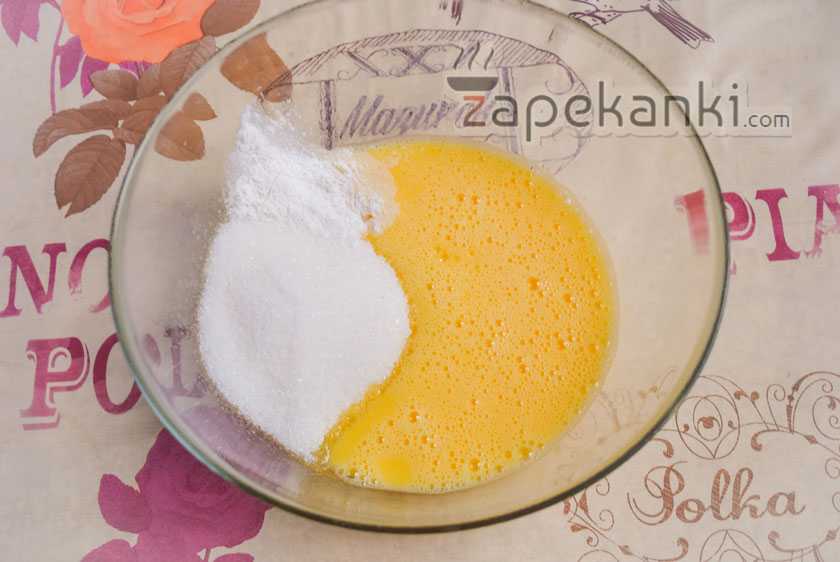 В отдельную миску разбиваем яйца и высыпаем сахарный песок. Взбиваем все вместе венчиком вручную или миксером. Желательно, чтобы все сахарные кристаллики растворились.