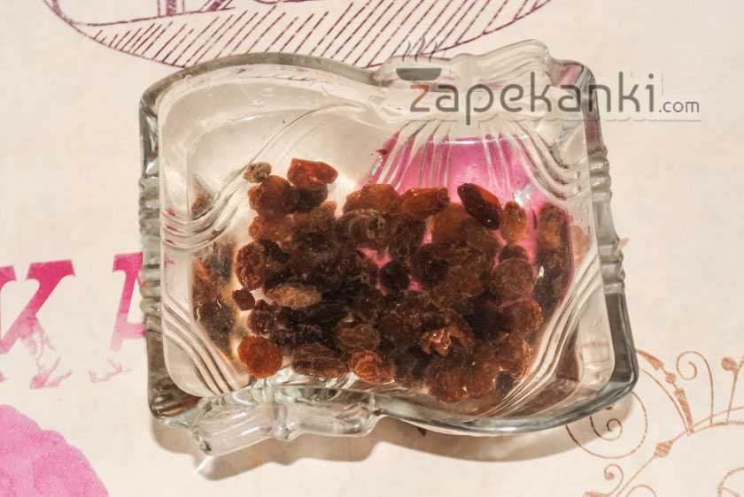 1. Горячей водой из чайника заливаем промытый изюм, оставляем на пять минут. Затем сцеживаем воду.