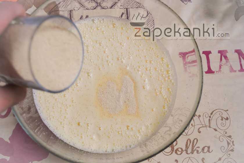 6. Далее в смесь нужно ввести манку. Только не высыпать сразу весь стакан и мешать, а тонкой струйкой всыпать, а второй рукой помешивать тесто. Так у вас крупа равномерно распределится по тесту и не возьмётся комочками.