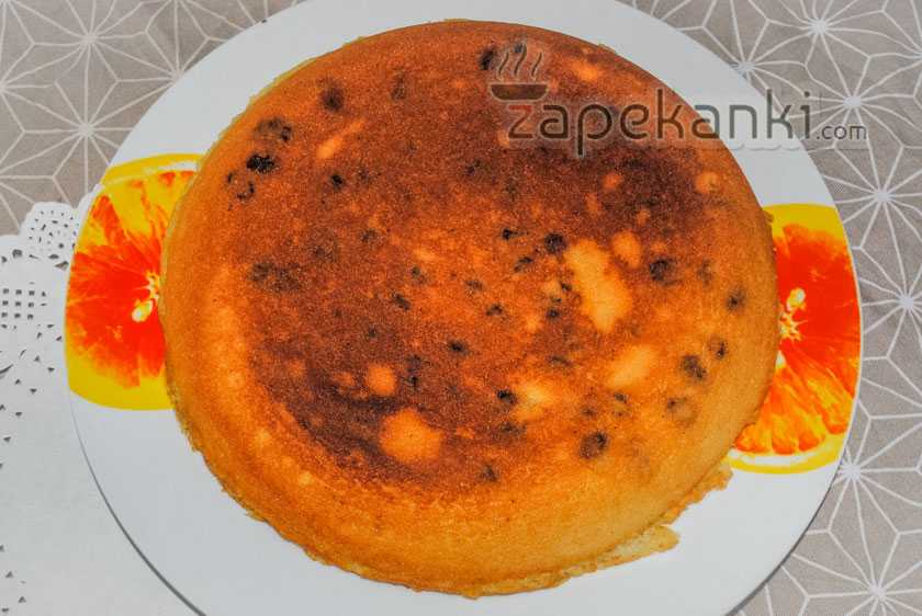 4. Отправляем тесто в форму, разравниваем и выпекаем пирог с изюмом 35 минут при 200 градусах. Мультиварка тоже годится для приготовления, в ней манник будет готовиться не менее 50 минут.