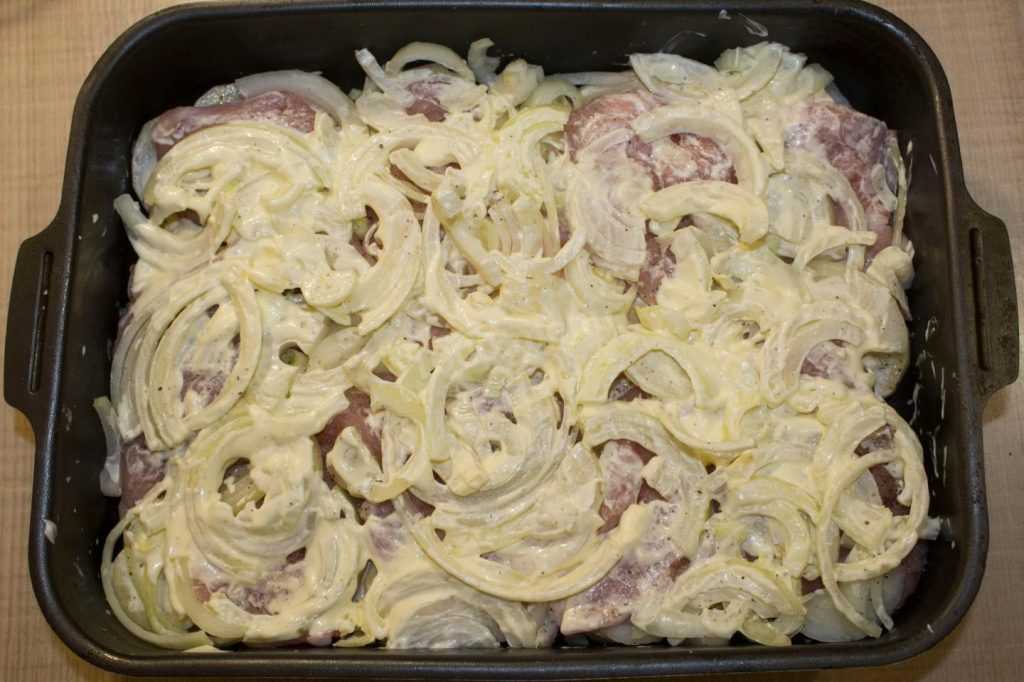 На заметку: рецепт по желанию можно модернизировать и полукольца лука обжарить с тертой морковью и затем уже выложить овощи слоем на мясо. Морковка добавит капельку сладкого привкуса, блюдо заиграет новыми яркими красками.