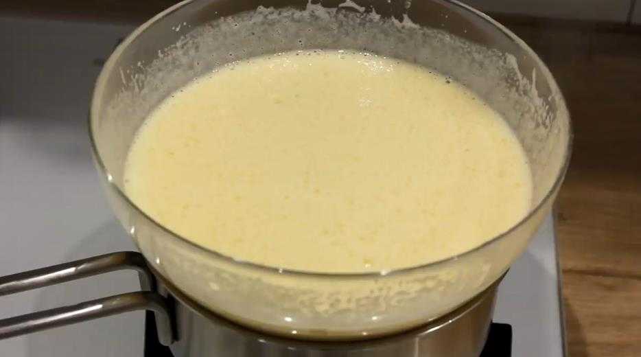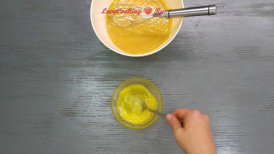 Переливаем жидкую основу теста в миску и даём немного остыть.