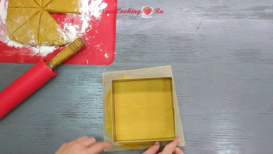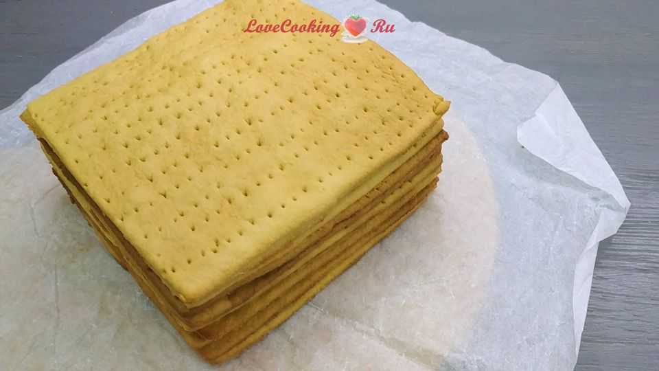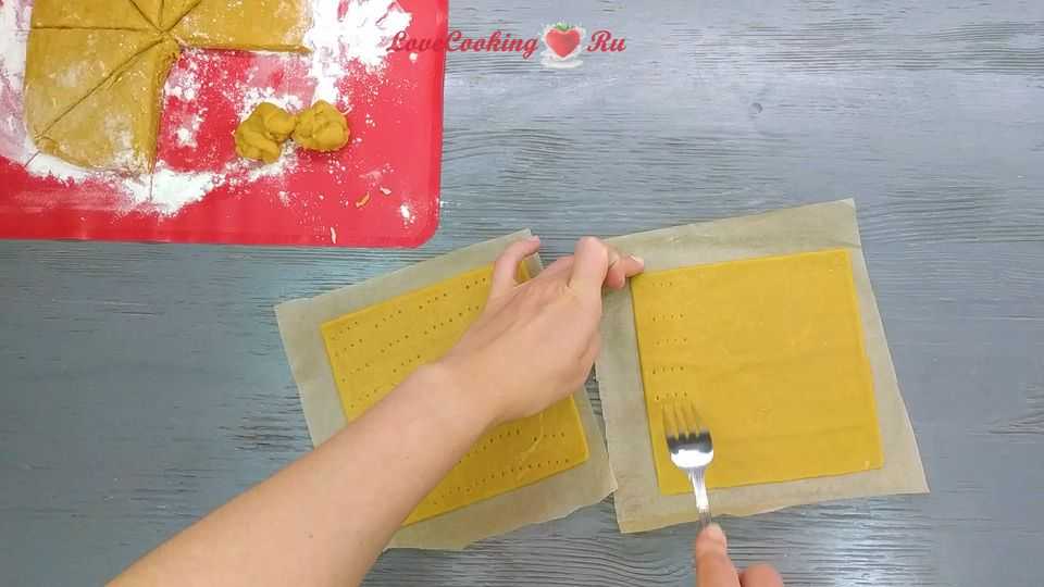 Раскатываем коржи тонко сразу на пергаменте. Обрезаем по форме. У меня это квадратная форма 16х16 см. Обязательно накалываем вилкой.Выпекаем при 180°С около 4-5 минут.