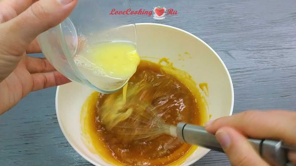 Вливаем яйца тонкой струйкой в медовую основу, постоянно перемешивая.
