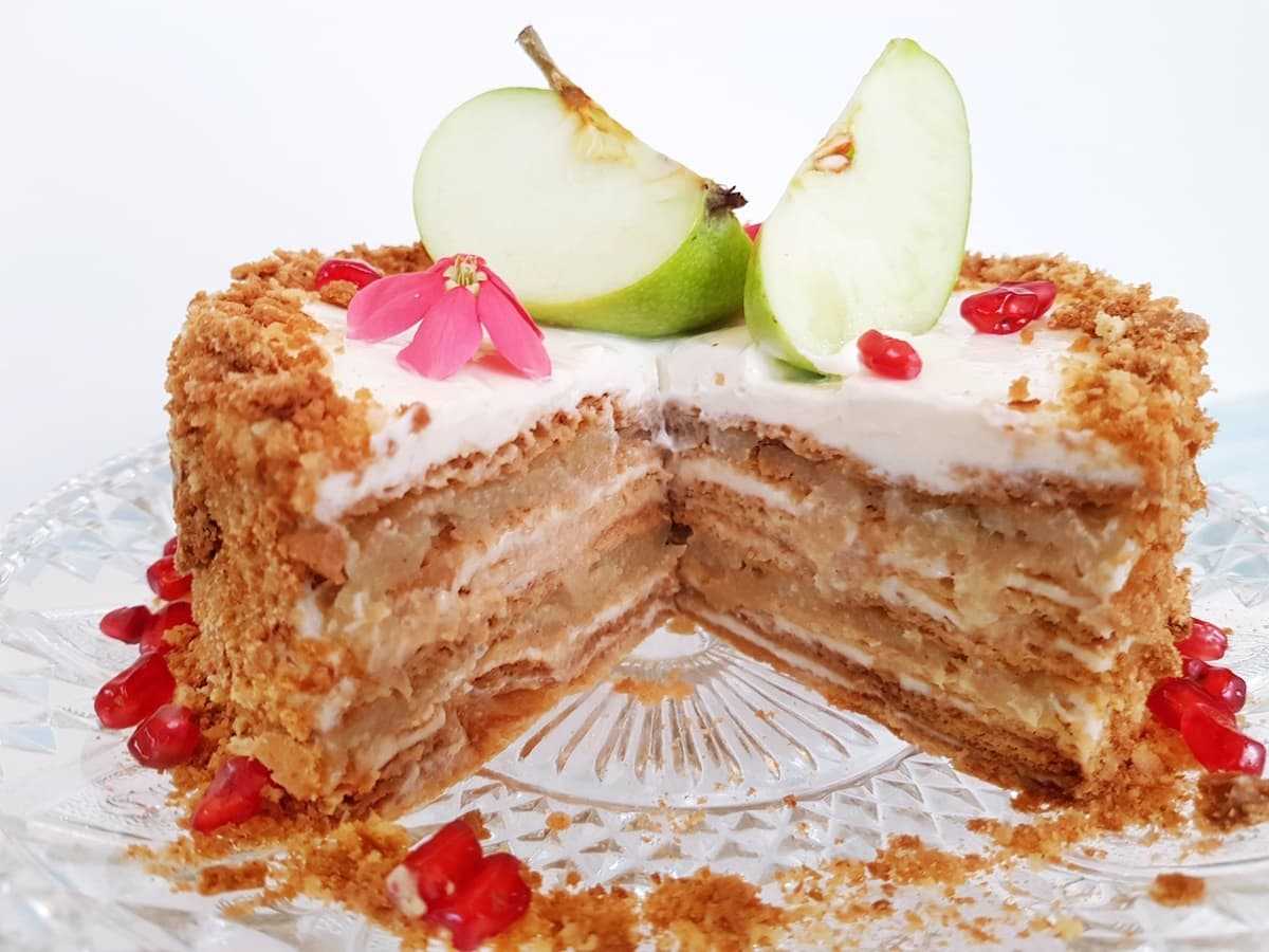 - Осталось добавить сливочное масло. Яблочный крем используем для обмазывания коржей.