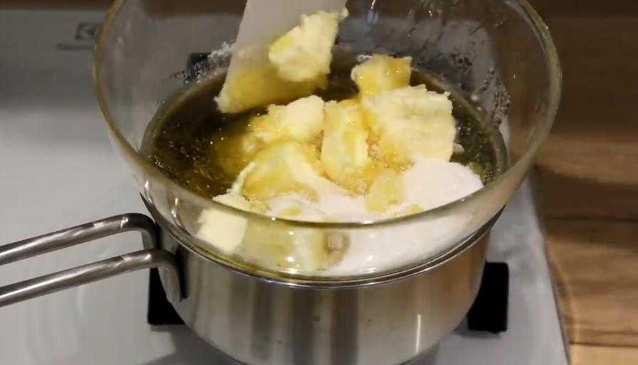 - Сливочное масло комнатной температуры соедините с яйцами, сахаром и медом в миске с толстым дном. Растопите на водяной бане или на низком огне. Постоянно помешивайте венчиком или силиконовой лопаткой.