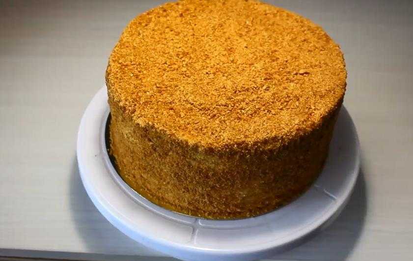 - Пока коржи теплые, положите их друг на друга и обрежьте края по форме торта (можно сверху положить тарелку и по ней сделать круглую форму торта). Крошку измельчите блендером, она будет служить обсыпкой для торта.